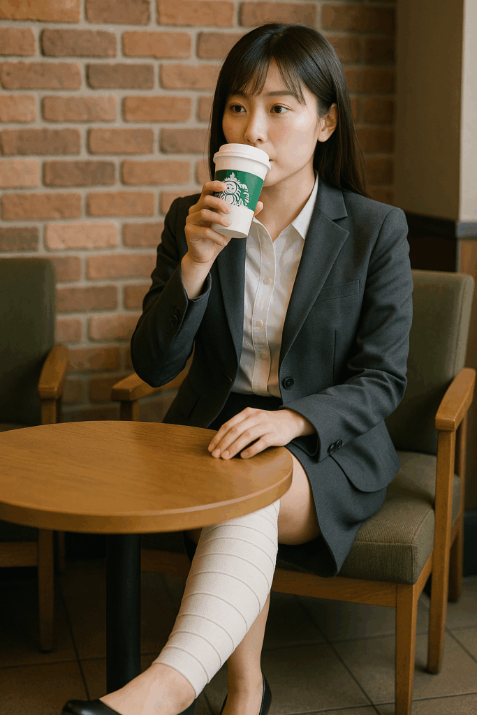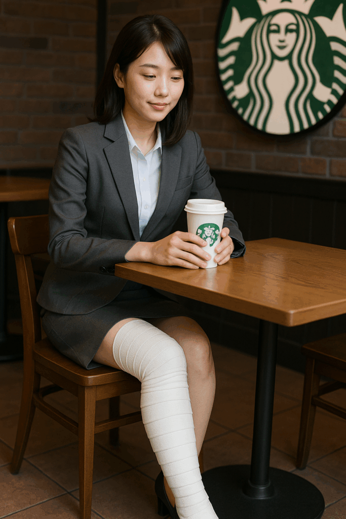 さらに続けて、昼休みにスタバで休憩させると、最初は、包帯の足が逆?巻かれ方が不十分で